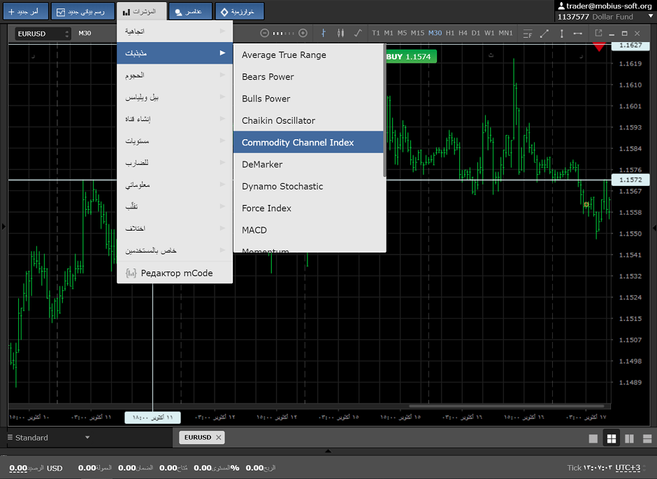 One more very popular indicators is Commodity Channel Index which task is to specify a price range which moves in a certain direction. It is placed in the section Indicators - Oscillators