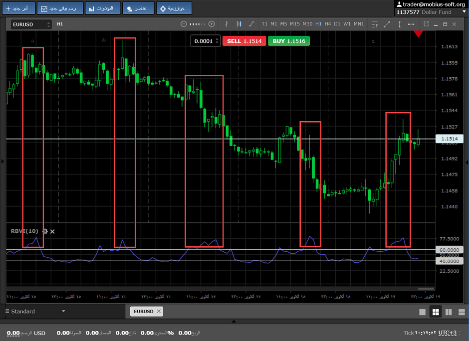 signals of RBVI indicator if the line of the indicator doesn't reach the level of 40%, the market is a flat one and if the indicator crosses the level of 60% - it is an active movement at the market