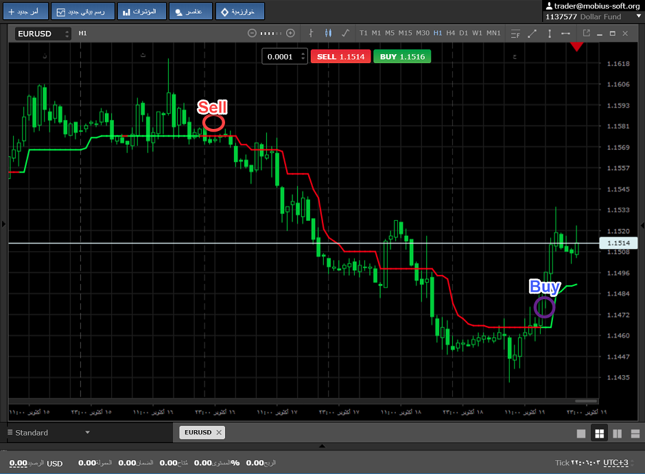 Работать по данному индикатору очень просто. Если линия индикатора позеленела, и цена находится выше нее, можем смело покупать, а если линия покраснела и цена ниже нее – мы продаем.