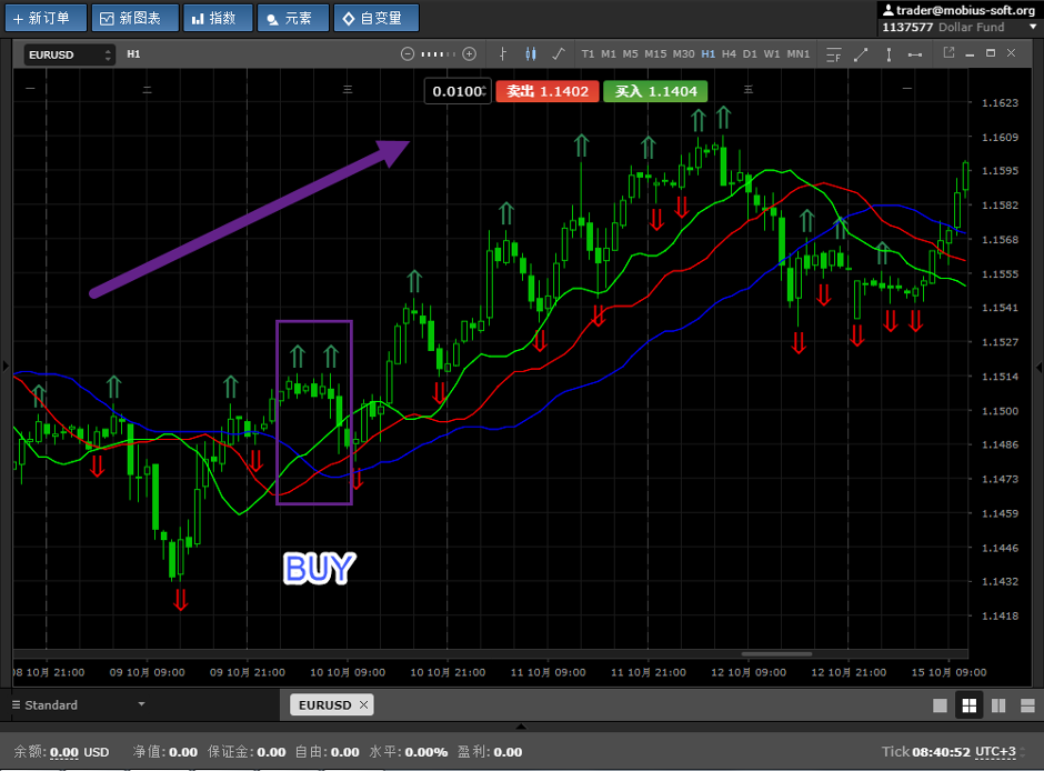 如果市场上击穿水平位,该位置上处于分形向上,且鳄鱼指标证明这一点,这就是市场上升趋势的信号,此时最好买入交易。