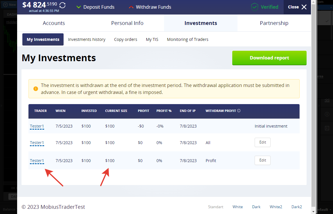 Profit Withdrawal - Investing $100 and earning another $20 in net profit will give you $20 and $100 will remain invested