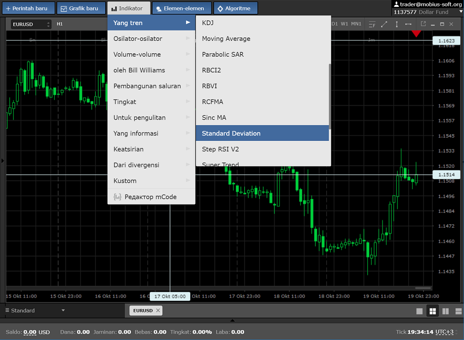 Dalam ulasan tersebut kami ingin bercerita tentang indikator Standard Deviation, yang termasuk grup indikator tren dan menunjukkan keatsirian pasar. Indikator tersebut terletak di bagian indikator «Yang tren»