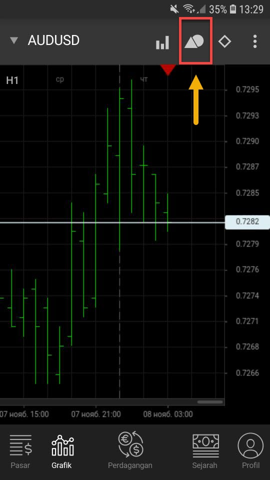 Для того, чтобы добавить на график цены графические элементы в терминале Mobius Trader 7 для Android вам необходимо перейти на вкладку График